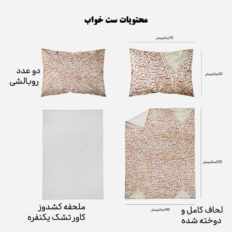 سرویس خواب مدوپد با طرحهای بسیار متنوع، رنگارنگ و زیبا، دقیقا همان چیزی را به شما ارائه میکند که دنبالش میگردید. مدوپد برای هر سلیقهای طرحی مناسب تولید کرده است. ست کاور لحاف مدوپد مناسب افرادی است که لحاف مناسب دارند و میخواهند یک سرویس اقتصادی بخرند تا از کاور لحاف برای روکش کردن آن استفاده کنند. این سرویس شامل دو روبالشی با دوخت پاکتی، یک کاور یا روکش لحاف زیپدار و یک روتشکی سفید دورکشدار است. داخل کاور لحاف نیز 4 بندینک دوخته شده که به کمک آنها میتوانید لحافتان را داخل کاور محکم کنید تا لیز نخورد. ابعاد روتشکی دورکشدار مناسب همه تشک های تک نفره است و تشک را به صورت کامل میپوشاند. ست خواب مدوپد تا وقتی که شما از آن خسته نشدهاید عمر میکند؛ با همان کیفیت روز اول. طرح و رنگ پارچه آن پس از شستوشو از بین نمیرود. استفاده از پارچههای مرغوب و بادوام، بهترین انتخاب را برای تغییر دکوراسیون اتاق خواب در اختیار شما میگذارد. محیط تولید محصولات کالای خواب مدوپد، فضایی بهداشتی و ایزوله بوده و مرتب توسط کارشناسان مورد بازرسی قرار می گیرد. همچنین ست خواب ها پس از تولید مورد بازبینی کیفی قرار گرفته و در دو مرحله بسته بندی می شوند. روتشکی مدوپد از جنس نخ صد درصد پنبه و جذب کننده کامل تعریق بدن است. محصولی که میخرید از بهترین پارچه ایرانی تهیه شده و طرح آن با استفاده از رنگهای درجه یک بر روی پارچه نقش بسته است. کاور لحاف زیپدار مدوپد از بهترین پارچههای ساتین موجود در بازار تهیه شده که ثبات و کیفیت رنگ آن را تضمین میکند. سیلیکون سُر و نرم ضد حساسیت و ضد باکتری تراکم بافت بسیار بالا با نرمی و لطافت بسیار زیاد، دوام و عمر پارچه را طولانی میکند. (باید توجه داشت که ساتین با ساتن فرق دارد. ساتین لیز نمیخورد و در مقایسه با ساتن براق نیست.) جنس این محصول ضدحساسیت، بسیار لطیف، سبک و خنک است و کمک میکند خواب عمیقتر و آرامتری داشته باشید. این سرویس خواب را میتوانید بدون ترس از آبرفتن یا تغییر رنگ و کیفیت در ماشین لباسشویی با دمای 30 درجه سانتی گراد بشویید. #نستعلیق #بیضی #مشکی #سفید #نقاشیخط #خوشنویسی #سیاهقلم