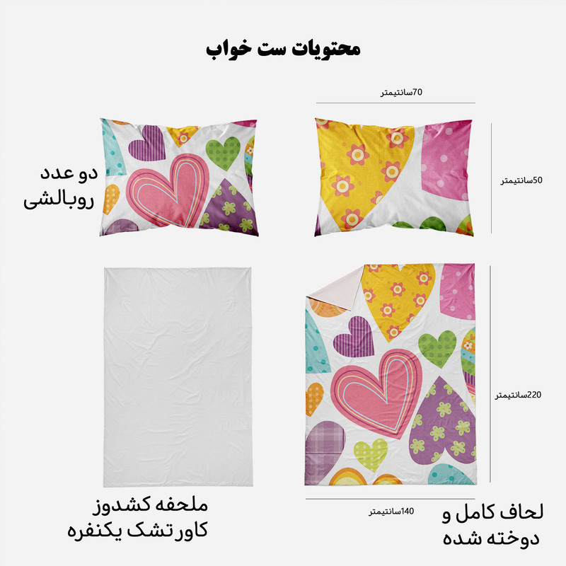 سرویس خواب مدوپد با طرحهای بسیار متنوع، رنگارنگ و زیبا، دقیقا همان چیزی را به شما ارائه میکند که دنبالش میگردید. مدوپد برای هر سلیقهای طرحی مناسب تولید کرده است. ست کاور لحاف مدوپد مناسب افرادی است که لحاف مناسب دارند و میخواهند یک سرویس اقتصادی بخرند تا از کاور لحاف برای روکش کردن آن استفاده کنند. این سرویس شامل دو روبالشی با دوخت پاکتی، یک کاور یا روکش لحاف زیپدار و یک روتشکی سفید دورکشدار است. داخل کاور لحاف نیز 4 بندینک دوخته شده که به کمک آنها میتوانید لحافتان را داخل کاور محکم کنید تا لیز نخورد. ابعاد روتشکی دورکشدار مناسب همه تشک های تک نفره است و تشک را به صورت کامل میپوشاند. ست خواب مدوپد تا وقتی که شما از آن خسته نشدهاید عمر میکند؛ با همان کیفیت روز اول. طرح و رنگ پارچه آن پس از شستوشو از بین نمیرود. استفاده از پارچههای مرغوب و بادوام، بهترین انتخاب را برای تغییر دکوراسیون اتاق خواب در اختیار شما میگذارد. محیط تولید محصولات کالای خواب مدوپد، فضایی بهداشتی و ایزوله بوده و مرتب توسط کارشناسان مورد بازرسی قرار می گیرد. همچنین ست خواب ها پس از تولید مورد بازبینی کیفی قرار گرفته و در دو مرحله بسته بندی می شوند. روتشکی مدوپد از جنس نخ صد درصد پنبه و جذب کننده کامل تعریق بدن است. محصولی که میخرید از بهترین پارچه ایرانی تهیه شده و طرح آن با استفاده از رنگهای درجه یک بر روی پارچه نقش بسته است. کاور لحاف زیپدار مدوپد از بهترین پارچههای ساتین موجود در بازار تهیه شده که ثبات و کیفیت رنگ آن را تضمین میکند. سیلیکون سُر و نرم ضد حساسیت و ضد باکتری تراکم بافت بسیار بالا با نرمی و لطافت بسیار زیاد، دوام و عمر پارچه را طولانی میکند. (باید توجه داشت که ساتین با ساتن فرق دارد. ساتین لیز نمیخورد و در مقایسه با ساتن براق نیست.) جنس این محصول ضدحساسیت، بسیار لطیف، سبک و خنک است و کمک میکند خواب عمیقتر و آرامتری داشته باشید. این سرویس خواب را میتوانید بدون ترس از آبرفتن یا تغییر رنگ و کیفیت در ماشین لباسشویی با دمای 30 درجه سانتی گراد بشویید. #تصویرسازی #قلب #صورتی #ارغوانی #نارنجی #سبز #آبی
