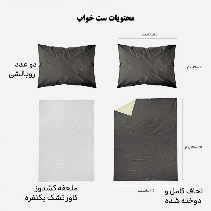 سرویس خواب مدوپد با طرحهای بسیار متنوع، رنگارنگ و زیبا، دقیقا همان چیزی را به شما ارائه میکند که دنبالش میگردید. مدوپد برای هر سلیقهای طرحی مناسب تولید کرده است. ست کاور لحاف مدوپد مناسب افرادی است که لحاف مناسب دارند و میخواهند یک سرویس اقتصادی بخرند تا از کاور لحاف برای روکش کردن آن استفاده کنند. این سرویس شامل دو روبالشی با دوخت پاکتی، یک کاور یا روکش لحاف زیپدار و یک روتشکی سفید دورکشدار است. داخل کاور لحاف نیز 4 بندینک دوخته شده که به کمک آنها میتوانید لحافتان را داخل کاور محکم کنید تا لیز نخورد. ابعاد روتشکی دورکشدار مناسب همه تشک های تک نفره است و تشک را به صورت کامل میپوشاند. ست خواب مدوپد تا وقتی که شما از آن خسته نشدهاید عمر میکند؛ با همان کیفیت روز اول. طرح و رنگ پارچه آن پس از شستوشو از بین نمیرود. استفاده از پارچههای مرغوب و بادوام، بهترین انتخاب را برای تغییر دکوراسیون اتاق خواب در اختیار شما میگذارد. محیط تولید محصولات کالای خواب مدوپد، فضایی بهداشتی و ایزوله بوده و مرتب توسط کارشناسان مورد بازرسی قرار می گیرد. همچنین ست خواب ها پس از تولید مورد بازبینی کیفی قرار گرفته و در دو مرحله بسته بندی می شوند. روتشکی مدوپد از جنس نخ صد درصد پنبه و جذب کننده کامل تعریق بدن است. محصولی که میخرید از بهترین پارچه ایرانی تهیه شده و طرح آن با استفاده از رنگهای درجه یک بر روی پارچه نقش بسته است. کاور لحاف زیپدار مدوپد از بهترین پارچههای ساتین موجود در بازار تهیه شده که ثبات و کیفیت رنگ آن را تضمین میکند. سیلیکون سُر و نرم ضد حساسیت و ضد باکتری تراکم بافت بسیار بالا با نرمی و لطافت بسیار زیاد، دوام و عمر پارچه را طولانی میکند. (باید توجه داشت که ساتین با ساتن فرق دارد. ساتین لیز نمیخورد و در مقایسه با ساتن براق نیست.) جنس این محصول ضدحساسیت، بسیار لطیف، سبک و خنک است و کمک میکند خواب عمیقتر و آرامتری داشته باشید. این سرویس خواب را میتوانید بدون ترس از آبرفتن یا تغییر رنگ و کیفیت در ماشین لباسشویی با دمای 30 درجه سانتی گراد بشویید. #خاکستری تیره #خاکستری دیوی