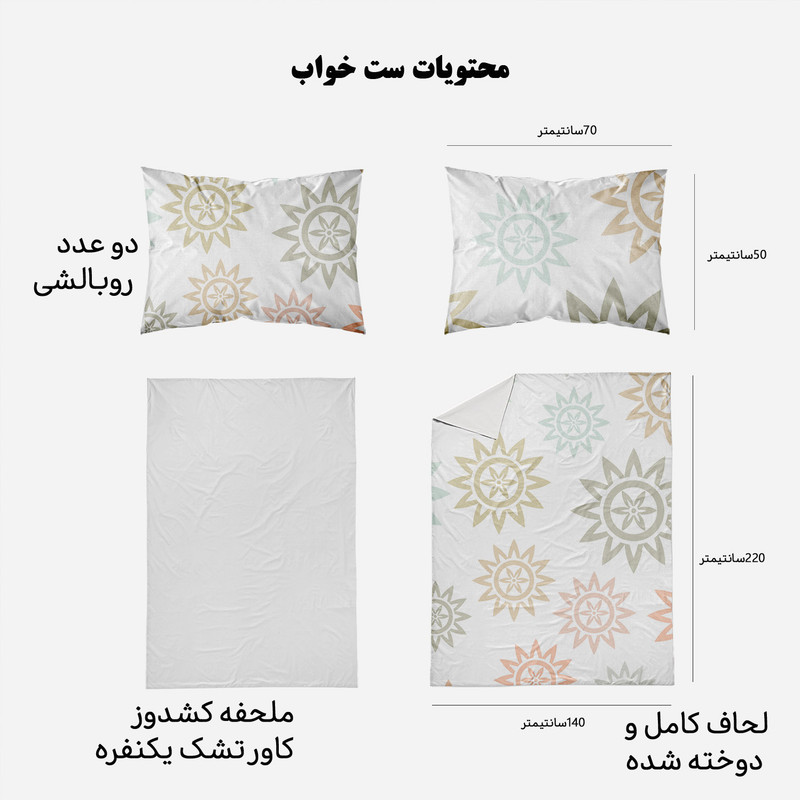 سرویس خواب مدوپد با طرحهای بسیار متنوع، رنگارنگ و زیبا، دقیقا همان چیزی را به شما ارائه میکند که دنبالش میگردید. مدوپد برای هر سلیقهای طرحی مناسب تولید کرده است. ست کاور لحاف مدوپد مناسب افرادی است که لحاف مناسب دارند و میخواهند یک سرویس اقتصادی بخرند تا از کاور لحاف برای روکش کردن آن استفاده کنند. این سرویس شامل دو روبالشی با دوخت پاکتی، یک کاور یا روکش لحاف زیپدار و یک روتشکی سفید دورکشدار است. داخل کاور لحاف نیز 4 بندینک دوخته شده که به کمک آنها میتوانید لحافتان را داخل کاور محکم کنید تا لیز نخورد. ابعاد روتشکی دورکشدار مناسب همه تشک های تک نفره است و تشک را به صورت کامل میپوشاند. ست خواب مدوپد تا وقتی که شما از آن خسته نشدهاید عمر میکند؛ با همان کیفیت روز اول. طرح و رنگ پارچه آن پس از شستوشو از بین نمیرود. استفاده از پارچههای مرغوب و بادوام، بهترین انتخاب را برای تغییر دکوراسیون اتاق خواب در اختیار شما میگذارد. محیط تولید محصولات کالای خواب مدوپد، فضایی بهداشتی و ایزوله بوده و مرتب توسط کارشناسان مورد بازرسی قرار می گیرد. همچنین ست خواب ها پس از تولید مورد بازبینی کیفی قرار گرفته و در دو مرحله بسته بندی می شوند. روتشکی مدوپد از جنس نخ صد درصد پنبه و جذب کننده کامل تعریق بدن است. محصولی که میخرید از بهترین پارچه ایرانی تهیه شده و طرح آن با استفاده از رنگهای درجه یک بر روی پارچه نقش بسته است. کاور لحاف زیپدار مدوپد از بهترین پارچههای ساتین موجود در بازار تهیه شده که ثبات و کیفیت رنگ آن را تضمین میکند. سیلیکون سُر و نرم ضد حساسیت و ضد باکتری تراکم بافت بسیار بالا با نرمی و لطافت بسیار زیاد، دوام و عمر پارچه را طولانی میکند. (باید توجه داشت که ساتین با ساتن فرق دارد. ساتین لیز نمیخورد و در مقایسه با ساتن براق نیست.) جنس این محصول ضدحساسیت، بسیار لطیف، سبک و خنک است و کمک میکند خواب عمیقتر و آرامتری داشته باشید. این سرویس خواب را میتوانید بدون ترس از آبرفتن یا تغییر رنگ و کیفیت در ماشین لباسشویی با دمای 30 درجه سانتی گراد بشویید. #تصویرسازی #مهر #خورشید #نارنجی #گلبهی #سبز #مدرن