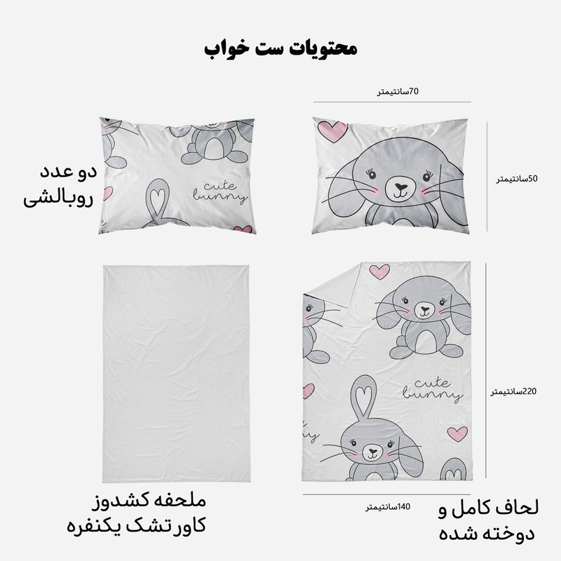 سرویس خواب مدوپد با طرحهای بسیار متنوع، رنگارنگ و زیبا، دقیقا همان چیزی را به شما ارائه میکند که دنبالش میگردید. مدوپد برای هر سلیقهای طرحی مناسب تولید کرده است. ست کاور لحاف مدوپد مناسب افرادی است که لحاف مناسب دارند و میخواهند یک سرویس اقتصادی بخرند تا از کاور لحاف برای روکش کردن آن استفاده کنند. این سرویس شامل دو روبالشی با دوخت پاکتی، یک کاور یا روکش لحاف زیپدار و یک روتشکی سفید دورکشدار است. داخل کاور لحاف نیز 4 بندینک دوخته شده که به کمک آنها میتوانید لحافتان را داخل کاور محکم کنید تا لیز نخورد. ابعاد روتشکی دورکشدار مناسب همه تشک های تک نفره است و تشک را به صورت کامل میپوشاند. ست خواب مدوپد تا وقتی که شما از آن خسته نشدهاید عمر میکند؛ با همان کیفیت روز اول. طرح و رنگ پارچه آن پس از شستوشو از بین نمیرود. استفاده از پارچههای مرغوب و بادوام، بهترین انتخاب را برای تغییر دکوراسیون اتاق خواب در اختیار شما میگذارد. محیط تولید محصولات کالای خواب مدوپد، فضایی بهداشتی و ایزوله بوده و مرتب توسط کارشناسان مورد بازرسی قرار می گیرد. همچنین ست خواب ها پس از تولید مورد بازبینی کیفی قرار گرفته و در دو مرحله بسته بندی می شوند. روتشکی مدوپد از جنس نخ صد درصد پنبه و جذب کننده کامل تعریق بدن است. محصولی که میخرید از بهترین پارچه ایرانی تهیه شده و طرح آن با استفاده از رنگهای درجه یک بر روی پارچه نقش بسته است. کاور لحاف زیپدار مدوپد از بهترین پارچههای ساتین موجود در بازار تهیه شده که ثبات و کیفیت رنگ آن را تضمین میکند. سیلیکون سُر و نرم ضد حساسیت و ضد باکتری تراکم بافت بسیار بالا با نرمی و لطافت بسیار زیاد، دوام و عمر پارچه را طولانی میکند. (باید توجه داشت که ساتین با ساتن فرق دارد. ساتین لیز نمیخورد و در مقایسه با ساتن براق نیست.) جنس این محصول ضدحساسیت، بسیار لطیف، سبک و خنک است و کمک میکند خواب عمیقتر و آرامتری داشته باشید. این سرویس خواب را میتوانید بدون ترس از آبرفتن یا تغییر رنگ و کیفیت در ماشین لباسشویی با دمای 30 درجه سانتی گراد بشویید. #تصویرسازی #خرگوش #صورتی #خاکستری #دخترانه #cute bunny
