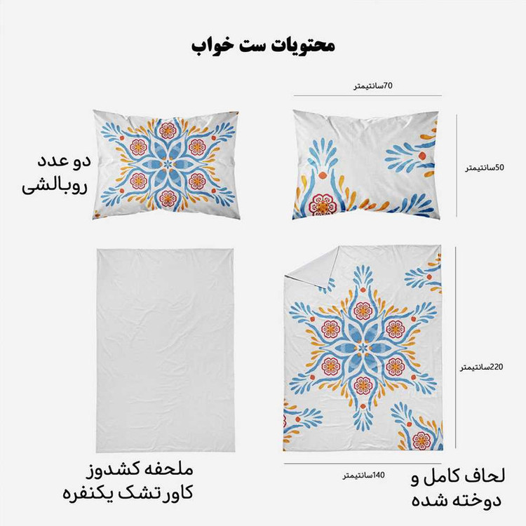سرویس خواب مدوپد با طرحهای بسیار متنوع، رنگارنگ و زیبا، دقیقا همان چیزی را به شما ارائه میکند که دنبالش میگردید. مدوپد برای هر سلیقهای طرحی مناسب تولید کرده است. ست کاور لحاف مدوپد مناسب افرادی است که لحاف مناسب دارند و میخواهند یک سرویس اقتصادی بخرند تا از کاور لحاف برای روکش کردن آن استفاده کنند. این سرویس شامل دو روبالشی با دوخت پاکتی، یک کاور یا روکش لحاف زیپدار و یک روتشکی سفید دورکشدار است. داخل کاور لحاف نیز 4 بندینک دوخته شده که به کمک آنها میتوانید لحافتان را داخل کاور محکم کنید تا لیز نخورد. ابعاد روتشکی دورکشدار مناسب همه تشک های تک نفره است و تشک را به صورت کامل میپوشاند. ست خواب مدوپد تا وقتی که شما از آن خسته نشدهاید عمر میکند؛ با همان کیفیت روز اول. طرح و رنگ پارچه آن پس از شستوشو از بین نمیرود. استفاده از پارچههای مرغوب و بادوام، بهترین انتخاب را برای تغییر دکوراسیون اتاق خواب در اختیار شما میگذارد. محیط تولید محصولات کالای خواب مدوپد، فضایی بهداشتی و ایزوله بوده و مرتب توسط کارشناسان مورد بازرسی قرار می گیرد. همچنین ست خواب ها پس از تولید مورد بازبینی کیفی قرار گرفته و در دو مرحله بسته بندی می شوند. روتشکی مدوپد از جنس نخ صد درصد پنبه و جذب کننده کامل تعریق بدن است. محصولی که میخرید از بهترین پارچه ایرانی تهیه شده و طرح آن با استفاده از رنگهای درجه یک بر روی پارچه نقش بسته است. کاور لحاف زیپدار مدوپد از بهترین پارچههای ساتین موجود در بازار تهیه شده که ثبات و کیفیت رنگ آن را تضمین میکند. سیلیکون سُر و نرم ضد حساسیت و ضد باکتری تراکم بافت بسیار بالا با نرمی و لطافت بسیار زیاد، دوام و عمر پارچه را طولانی میکند. (باید توجه داشت که ساتین با ساتن فرق دارد. ساتین لیز نمیخورد و در مقایسه با ساتن براق نیست.) جنس این محصول ضدحساسیت، بسیار لطیف، سبک و خنک است و کمک میکند خواب عمیقتر و آرامتری داشته باشید. این سرویس خواب را میتوانید بدون ترس از آبرفتن یا تغییر رنگ و کیفیت در ماشین لباسشویی با دمای 30 درجه سانتی گراد بشویید.