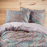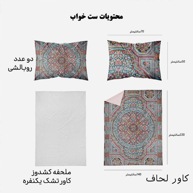 سرویس خواب مدوپد با طرحهای بسیار متنوع، رنگارنگ و زیبا، دقیقا همان چیزی را به شما ارائه میکند که دنبالش میگردید. مدوپد برای هر سلیقهای طرحی مناسب تولید کرده است. ست کاور لحاف مدوپد مناسب افرادی است که لحاف مناسب دارند و میخواهند یک سرویس اقتصادی بخرند تا از کاور لحاف برای روکش کردن آن استفاده کنند. این سرویس شامل دو روبالشی با دوخت پاکتی، یک کاور یا روکش لحاف زیپدار و یک روتشکی سفید دورکشدار است. داخل کاور لحاف نیز 4 بندینک دوخته شده که به کمک آنها میتوانید لحافتان را داخل کاور محکم کنید تا لیز نخورد. ابعاد روتشکی دورکشدار مناسب همه تشک های تک نفره است و تشک را به صورت کامل میپوشاند. ست خواب مدوپد تا وقتی که شما از آن خسته نشدهاید عمر میکند؛ با همان کیفیت روز اول. طرح و رنگ پارچه آن پس از شستوشو از بین نمیرود. استفاده از پارچههای مرغوب و بادوام، بهترین انتخاب را برای تغییر دکوراسیون اتاق خواب در اختیار شما میگذارد. محیط تولید محصولات کالای خواب مدوپد، فضایی بهداشتی و ایزوله بوده و مرتب توسط کارشناسان مورد بازرسی قرار می گیرد. همچنین ست خواب ها پس از تولید مورد بازبینی کیفی قرار گرفته و در دو مرحله بسته بندی می شوند. روتشکی مدوپد از جنس نخ صد درصد پنبه و جذب کننده کامل تعریق بدن است. محصولی که میخرید از بهترین پارچه ایرانی تهیه شده و طرح آن با استفاده از رنگهای درجه یک بر روی پارچه نقش بسته است. کاور لحاف زیپدار مدوپد از بهترین پارچههای ساتین موجود در بازار تهیه شده که ثبات و کیفیت رنگ آن را تضمین میکند. سیلیکون سُر و نرم ضد حساسیت و ضد باکتری تراکم بافت بسیار بالا با نرمی و لطافت بسیار زیاد، دوام و عمر پارچه را طولانی میکند. (باید توجه داشت که ساتین با ساتن فرق دارد. ساتین لیز نمیخورد و در مقایسه با ساتن براق نیست.) جنس این محصول ضدحساسیت، بسیار لطیف، سبک و خنک است و کمک میکند خواب عمیقتر و آرامتری داشته باشید. این سرویس خواب را میتوانید بدون ترس از آبرفتن یا تغییر رنگ و کیفیت در ماشین لباسشویی با دمای 30 درجه سانتی گراد بشویید. فرش قم زمینه سیاه آبی سرخابی ترنج قابی صورتی