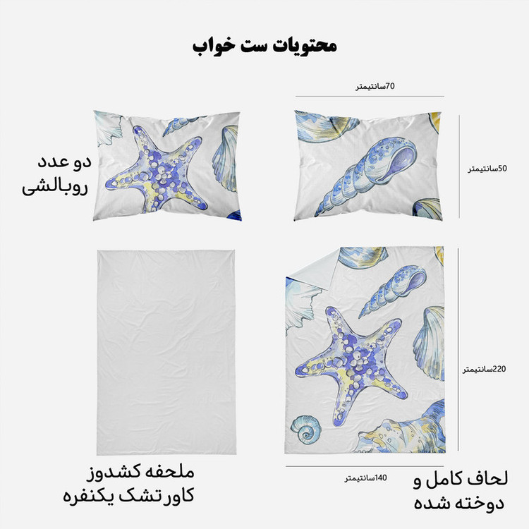 سرویس خواب مدوپد با طرحهای بسیار متنوع، رنگارنگ و زیبا، دقیقا همان چیزی را به شما ارائه میکند که دنبالش میگردید. مدوپد برای هر سلیقهای طرحی مناسب تولید کرده است. ست کاور لحاف مدوپد مناسب افرادی است که لحاف مناسب دارند و میخواهند یک سرویس اقتصادی بخرند تا از کاور لحاف برای روکش کردن آن استفاده کنند. این سرویس شامل دو روبالشی با دوخت پاکتی، یک کاور یا روکش لحاف زیپدار و یک روتشکی سفید دورکشدار است. داخل کاور لحاف نیز 4 بندینک دوخته شده که به کمک آنها میتوانید لحافتان را داخل کاور محکم کنید تا لیز نخورد. ابعاد روتشکی دورکشدار مناسب همه تشک های تک نفره است و تشک را به صورت کامل میپوشاند. ست خواب مدوپد تا وقتی که شما از آن خسته نشدهاید عمر میکند؛ با همان کیفیت روز اول. طرح و رنگ پارچه آن پس از شستوشو از بین نمیرود. استفاده از پارچههای مرغوب و بادوام، بهترین انتخاب را برای تغییر دکوراسیون اتاق خواب در اختیار شما میگذارد. محیط تولید محصولات کالای خواب مدوپد، فضایی بهداشتی و ایزوله بوده و مرتب توسط کارشناسان مورد بازرسی قرار می گیرد. همچنین ست خواب ها پس از تولید مورد بازبینی کیفی قرار گرفته و در دو مرحله بسته بندی می شوند. روتشکی مدوپد از جنس نخ صد درصد پنبه و جذب کننده کامل تعریق بدن است. محصولی که میخرید از بهترین پارچه ایرانی تهیه شده و طرح آن با استفاده از رنگهای درجه یک بر روی پارچه نقش بسته است. کاور لحاف زیپدار مدوپد از بهترین پارچههای ساتین موجود در بازار تهیه شده که ثبات و کیفیت رنگ آن را تضمین میکند. سیلیکون سُر و نرم ضد حساسیت و ضد باکتری تراکم بافت بسیار بالا با نرمی و لطافت بسیار زیاد، دوام و عمر پارچه را طولانی میکند. (باید توجه داشت که ساتین با ساتن فرق دارد. ساتین لیز نمیخورد و در مقایسه با ساتن براق نیست.) جنس این محصول ضدحساسیت، بسیار لطیف، سبک و خنک است و کمک میکند خواب عمیقتر و آرامتری داشته باشید. این سرویس خواب را میتوانید بدون ترس از آبرفتن یا تغییر رنگ و کیفیت در ماشین لباسشویی با دمای 30 درجه سانتی گراد بشویید. #تصویرسازی #صدف #ستاره دریایی #زرد #آبی #نباتی #گوشماهی