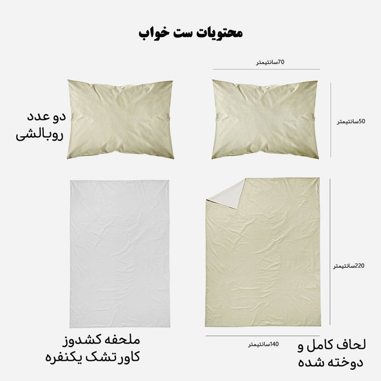 سرویس خواب مدوپد با طرحهای بسیار متنوع، رنگارنگ و زیبا، دقیقا همان چیزی را به شما ارائه میکند که دنبالش میگردید. مدوپد برای هر سلیقهای طرحی مناسب تولید کرده است. ست کاور لحاف مدوپد مناسب افرادی است که لحاف مناسب دارند و میخواهند یک سرویس اقتصادی بخرند تا از کاور لحاف برای روکش کردن آن استفاده کنند. این سرویس شامل دو روبالشی با دوخت پاکتی، یک کاور یا روکش لحاف زیپدار و یک روتشکی سفید دورکشدار است. داخل کاور لحاف نیز 4 بندینک دوخته شده که به کمک آنها میتوانید لحافتان را داخل کاور محکم کنید تا لیز نخورد. ابعاد روتشکی دورکشدار مناسب همه تشک های تک نفره است و تشک را به صورت کامل میپوشاند. ست خواب مدوپد تا وقتی که شما از آن خسته نشدهاید عمر میکند؛ با همان کیفیت روز اول. طرح و رنگ پارچه آن پس از شستوشو از بین نمیرود. استفاده از پارچههای مرغوب و بادوام، بهترین انتخاب را برای تغییر دکوراسیون اتاق خواب در اختیار شما میگذارد. محیط تولید محصولات کالای خواب مدوپد، فضایی بهداشتی و ایزوله بوده و مرتب توسط کارشناسان مورد بازرسی قرار می گیرد. همچنین ست خواب ها پس از تولید مورد بازبینی کیفی قرار گرفته و در دو مرحله بسته بندی می شوند. روتشکی مدوپد از جنس نخ صد درصد پنبه و جذب کننده کامل تعریق بدن است. محصولی که میخرید از بهترین پارچه ایرانی تهیه شده و طرح آن با استفاده از رنگهای درجه یک بر روی پارچه نقش بسته است. کاور لحاف زیپدار مدوپد از بهترین پارچههای ساتین موجود در بازار تهیه شده که ثبات و کیفیت رنگ آن را تضمین میکند. سیلیکون سُر و نرم ضد حساسیت و ضد باکتری تراکم بافت بسیار بالا با نرمی و لطافت بسیار زیاد، دوام و عمر پارچه را طولانی میکند. (باید توجه داشت که ساتین با ساتن فرق دارد. ساتین لیز نمیخورد و در مقایسه با ساتن براق نیست.) جنس این محصول ضدحساسیت، بسیار لطیف، سبک و خنک است و کمک میکند خواب عمیقتر و آرامتری داشته باشید. این سرویس خواب را میتوانید بدون ترس از آبرفتن یا تغییر رنگ و کیفیت در ماشین لباسشویی با دمای 30 درجه سانتی گراد بشویید. #کرم روشن #نباتی #شیری #کیهان #جهان