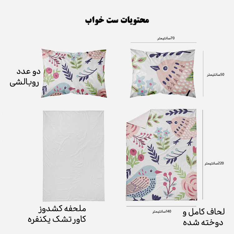 سرویس خواب مدوپد با طرحهای بسیار متنوع، رنگارنگ و زیبا، دقیقا همان چیزی را به شما ارائه میکند که دنبالش میگردید. مدوپد برای هر سلیقهای طرحی مناسب تولید کرده است. ست کاور لحاف مدوپد مناسب افرادی است که لحاف مناسب دارند و میخواهند یک سرویس اقتصادی بخرند تا از کاور لحاف برای روکش کردن آن استفاده کنند. این سرویس شامل دو روبالشی با دوخت پاکتی، یک کاور یا روکش لحاف زیپدار و یک روتشکی سفید دورکشدار است. داخل کاور لحاف نیز 4 بندینک دوخته شده که به کمک آنها میتوانید لحافتان را داخل کاور محکم کنید تا لیز نخورد. ابعاد روتشکی دورکشدار مناسب همه تشک های تک نفره است و تشک را به صورت کامل میپوشاند. ست خواب مدوپد تا وقتی که شما از آن خسته نشدهاید عمر میکند؛ با همان کیفیت روز اول. طرح و رنگ پارچه آن پس از شستوشو از بین نمیرود. استفاده از پارچههای مرغوب و بادوام، بهترین انتخاب را برای تغییر دکوراسیون اتاق خواب در اختیار شما میگذارد. محیط تولید محصولات کالای خواب مدوپد، فضایی بهداشتی و ایزوله بوده و مرتب توسط کارشناسان مورد بازرسی قرار می گیرد. همچنین ست خواب ها پس از تولید مورد بازبینی کیفی قرار گرفته و در دو مرحله بسته بندی می شوند. روتشکی مدوپد از جنس نخ صد درصد پنبه و جذب کننده کامل تعریق بدن است. محصولی که میخرید از بهترین پارچه ایرانی تهیه شده و طرح آن با استفاده از رنگهای درجه یک بر روی پارچه نقش بسته است. کاور لحاف زیپدار مدوپد از بهترین پارچههای ساتین موجود در بازار تهیه شده که ثبات و کیفیت رنگ آن را تضمین میکند. سیلیکون سُر و نرم ضد حساسیت و ضد باکتری تراکم بافت بسیار بالا با نرمی و لطافت بسیار زیاد، دوام و عمر پارچه را طولانی میکند. (باید توجه داشت که ساتین با ساتن فرق دارد. ساتین لیز نمیخورد و در مقایسه با ساتن براق نیست.) جنس این محصول ضدحساسیت، بسیار لطیف، سبک و خنک است و کمک میکند خواب عمیقتر و آرامتری داشته باشید. این سرویس خواب را میتوانید بدون ترس از آبرفتن یا تغییر رنگ و کیفیت در ماشین لباسشویی با دمای 30 درجه سانتی گراد بشویید. #تصویرسازی #آبی #تیرز #سورمهای #گنجشک #گل #رنگارنگ