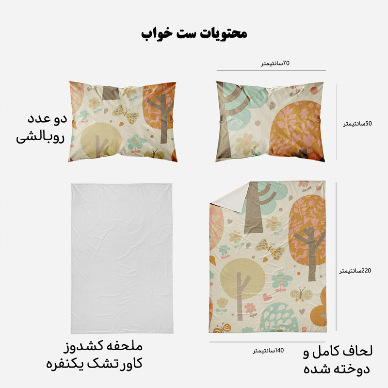 سرویس خواب مدوپد با طرحهای بسیار متنوع، رنگارنگ و زیبا، دقیقا همان چیزی را به شما ارائه میکند که دنبالش میگردید. مدوپد برای هر سلیقهای طرحی مناسب تولید کرده است. ست کاور لحاف مدوپد مناسب افرادی است که لحاف مناسب دارند و میخواهند یک سرویس اقتصادی بخرند تا از کاور لحاف برای روکش کردن آن استفاده کنند. این سرویس شامل دو روبالشی با دوخت پاکتی، یک کاور یا روکش لحاف زیپدار و یک روتشکی سفید دورکشدار است. داخل کاور لحاف نیز 4 بندینک دوخته شده که به کمک آنها میتوانید لحافتان را داخل کاور محکم کنید تا لیز نخورد. ابعاد روتشکی دورکشدار مناسب همه تشک های تک نفره است و تشک را به صورت کامل میپوشاند. ست خواب مدوپد تا وقتی که شما از آن خسته نشدهاید عمر میکند؛ با همان کیفیت روز اول. طرح و رنگ پارچه آن پس از شستوشو از بین نمیرود. استفاده از پارچههای مرغوب و بادوام، بهترین انتخاب را برای تغییر دکوراسیون اتاق خواب در اختیار شما میگذارد. محیط تولید محصولات کالای خواب مدوپد، فضایی بهداشتی و ایزوله بوده و مرتب توسط کارشناسان مورد بازرسی قرار می گیرد. همچنین ست خواب ها پس از تولید مورد بازبینی کیفی قرار گرفته و در دو مرحله بسته بندی می شوند. روتشکی مدوپد از جنس نخ صد درصد پنبه و جذب کننده کامل تعریق بدن است. محصولی که میخرید از بهترین پارچه ایرانی تهیه شده و طرح آن با استفاده از رنگهای درجه یک بر روی پارچه نقش بسته است. کاور لحاف زیپدار مدوپد از بهترین پارچههای ساتین موجود در بازار تهیه شده که ثبات و کیفیت رنگ آن را تضمین میکند. سیلیکون سُر و نرم ضد حساسیت و ضد باکتری تراکم بافت بسیار بالا با نرمی و لطافت بسیار زیاد، دوام و عمر پارچه را طولانی میکند. (باید توجه داشت که ساتین با ساتن فرق دارد. ساتین لیز نمیخورد و در مقایسه با ساتن براق نیست.) جنس این محصول ضدحساسیت، بسیار لطیف، سبک و خنک است و کمک میکند خواب عمیقتر و آرامتری داشته باشید. این سرویس خواب را میتوانید بدون ترس از آبرفتن یا تغییر رنگ و کیفیت در ماشین لباسشویی با دمای 30 درجه سانتی گراد بشویید. #تصویرسازی #نارنجی #سدری #سبز #گلبهی #درخت #رنگارنگ
