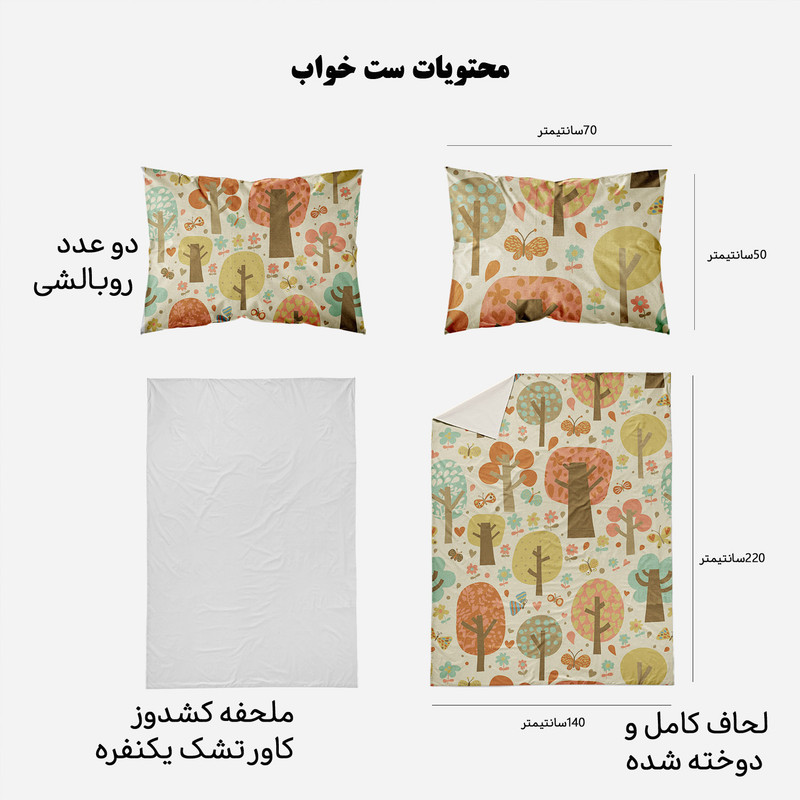 سرویس خواب مدوپد با طرحهای بسیار متنوع، رنگارنگ و زیبا، دقیقا همان چیزی را به شما ارائه میکند که دنبالش میگردید. مدوپد برای هر سلیقهای طرحی مناسب تولید کرده است. ست کاور لحاف مدوپد مناسب افرادی است که لحاف مناسب دارند و میخواهند یک سرویس اقتصادی بخرند تا از کاور لحاف برای روکش کردن آن استفاده کنند. این سرویس شامل دو روبالشی با دوخت پاکتی، یک کاور یا روکش لحاف زیپدار و یک روتشکی سفید دورکشدار است. داخل کاور لحاف نیز 4 بندینک دوخته شده که به کمک آنها میتوانید لحافتان را داخل کاور محکم کنید تا لیز نخورد. ابعاد روتشکی دورکشدار مناسب همه تشک های تک نفره است و تشک را به صورت کامل میپوشاند. ست خواب مدوپد تا وقتی که شما از آن خسته نشدهاید عمر میکند؛ با همان کیفیت روز اول. طرح و رنگ پارچه آن پس از شستوشو از بین نمیرود. استفاده از پارچههای مرغوب و بادوام، بهترین انتخاب را برای تغییر دکوراسیون اتاق خواب در اختیار شما میگذارد. محیط تولید محصولات کالای خواب مدوپد، فضایی بهداشتی و ایزوله بوده و مرتب توسط کارشناسان مورد بازرسی قرار می گیرد. همچنین ست خواب ها پس از تولید مورد بازبینی کیفی قرار گرفته و در دو مرحله بسته بندی می شوند. روتشکی مدوپد از جنس نخ صد درصد پنبه و جذب کننده کامل تعریق بدن است. محصولی که میخرید از بهترین پارچه ایرانی تهیه شده و طرح آن با استفاده از رنگهای درجه یک بر روی پارچه نقش بسته است. کاور لحاف زیپدار مدوپد از بهترین پارچههای ساتین موجود در بازار تهیه شده که ثبات و کیفیت رنگ آن را تضمین میکند. سیلیکون سُر و نرم ضد حساسیت و ضد باکتری تراکم بافت بسیار بالا با نرمی و لطافت بسیار زیاد، دوام و عمر پارچه را طولانی میکند. (باید توجه داشت که ساتین با ساتن فرق دارد. ساتین لیز نمیخورد و در مقایسه با ساتن براق نیست.) جنس این محصول ضدحساسیت، بسیار لطیف، سبک و خنک است و کمک میکند خواب عمیقتر و آرامتری داشته باشید. این سرویس خواب را میتوانید بدون ترس از آبرفتن یا تغییر رنگ و کیفیت در ماشین لباسشویی با دمای 30 درجه سانتی گراد بشویید. #تصویرسازی #درخت #نارنجی #آجری #خردلی #قهوهای #آبی