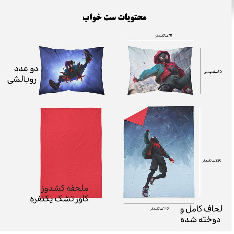 ست خواب یکنفره 4 تکه شامل دو عدد روبالشی 70در50، یک لحاف کامل دوخته شده 150 در 220 و یک ملحفه کشدوز مناسب تخت های یکنفره تا عرض 110 سانتیمتر