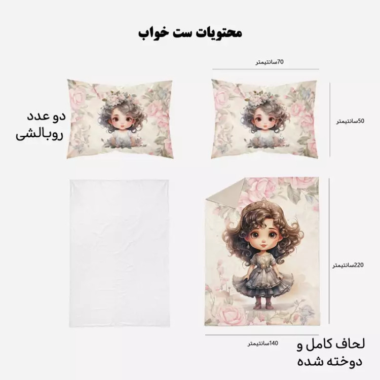 ست خواب یکنفره 4 تکه شامل دو عدد روبالشی 70در50، یک لحاف کامل دوخته شده 150 در 220 و یک ملحفه کشدوز مناسب تخت های یکنفره تا عرض 110 سانتیمتر