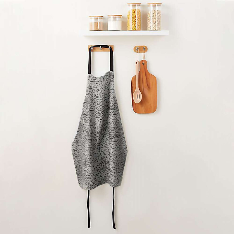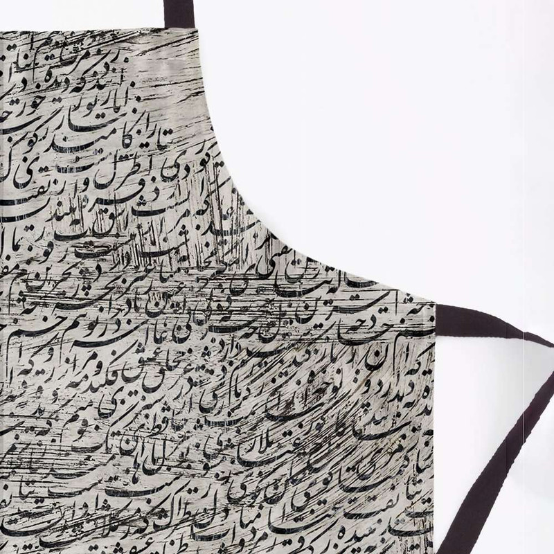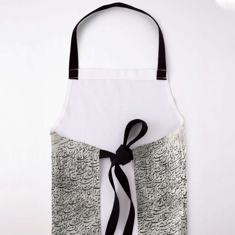 پیشبند جزیی از ملزومات حرفه ای آشپزخانه شماست. پیشبندهای برند مدوپد، جهت محافظت از لباس شما و داشتن احساسی بهتر، بسیار حرفه ای و کاربردی طراحی شده و در عین حال طرح های بسیار متنوع آن هر سلیقه ای را راضی میکند. پارچه این پیشبند از جنس کتان است و زیر آن یک آستر پلاستیکی ضد آب، لحاظ شده. با داشتن پیشبند مدوپد، از حضورتان در آشپزخانه لذت میبرید و ثبت خاطره خواهید داشت. سفید مشکی خوشنویسی خطاطی نستعلیق تایپوگرافی کالیگرافی