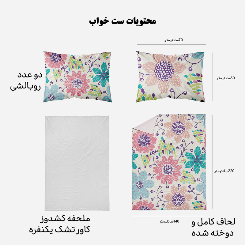 سرویس خواب مدوپد با طرحهای بسیار متنوع، رنگارنگ و زیبا، دقیقا همان چیزی را به شما ارائه میکند که دنبالش میگردید. مدوپد برای هر سلیقهای طرحی مناسب تولید کرده است. ست کاور لحاف مدوپد مناسب افرادی است که لحاف مناسب دارند و میخواهند یک سرویس اقتصادی بخرند تا از کاور لحاف برای روکش کردن آن استفاده کنند. این سرویس شامل دو روبالشی با دوخت پاکتی، یک کاور یا روکش لحاف زیپدار و یک روتشکی سفید دورکشدار است. داخل کاور لحاف نیز 4 بندینک دوخته شده که به کمک آنها میتوانید لحافتان را داخل کاور محکم کنید تا لیز نخورد. ابعاد روتشکی دورکشدار مناسب همه تشک های تک نفره است و تشک را به صورت کامل میپوشاند. ست خواب مدوپد تا وقتی که شما از آن خسته نشدهاید عمر میکند؛ با همان کیفیت روز اول. طرح و رنگ پارچه آن پس از شستوشو از بین نمیرود. استفاده از پارچههای مرغوب و بادوام، بهترین انتخاب را برای تغییر دکوراسیون اتاق خواب در اختیار شما میگذارد. محیط تولید محصولات کالای خواب مدوپد، فضایی بهداشتی و ایزوله بوده و مرتب توسط کارشناسان مورد بازرسی قرار می گیرد. همچنین ست خواب ها پس از تولید مورد بازبینی کیفی قرار گرفته و در دو مرحله بسته بندی می شوند. روتشکی مدوپد از جنس نخ صد درصد پنبه و جذب کننده کامل تعریق بدن است. محصولی که میخرید از بهترین پارچه ایرانی تهیه شده و طرح آن با استفاده از رنگهای درجه یک بر روی پارچه نقش بسته است. کاور لحاف زیپدار مدوپد از بهترین پارچههای ساتین موجود در بازار تهیه شده که ثبات و کیفیت رنگ آن را تضمین میکند. سیلیکون سُر و نرم ضد حساسیت و ضد باکتری تراکم بافت بسیار بالا با نرمی و لطافت بسیار زیاد، دوام و عمر پارچه را طولانی میکند. (باید توجه داشت که ساتین با ساتن فرق دارد. ساتین لیز نمیخورد و در مقایسه با ساتن براق نیست.) جنس این محصول ضدحساسیت، بسیار لطیف، سبک و خنک است و کمک میکند خواب عمیقتر و آرامتری داشته باشید. این سرویس خواب را میتوانید بدون ترس از آبرفتن یا تغییر رنگ و کیفیت در ماشین لباسشویی با دمای 30 درجه سانتی گراد بشویید. #تصویرسازی #نارنجی #مرجانی #آبی #سبزآبی #شیری #سبز مغزپستهای
